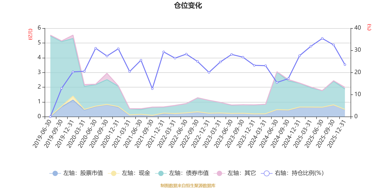 据定期报告数据统计,近三年平均股票仓位为25.79%,同类平均为19.2%。2025年上半年末基金达到35.37%的最高仓位,2021年三季度末最低,为12.66%。