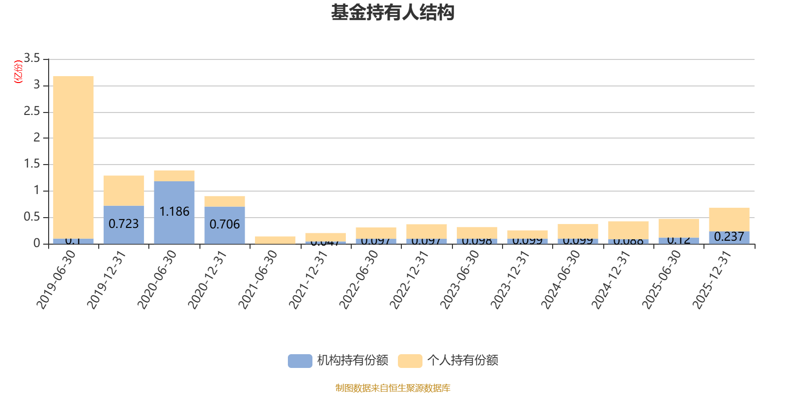 截至2025年12月31日,基金持有人共计1783户,合计持有6838.04万份。其中管理人员工持有23.85万份,占比0.35%,机构持有份额占比34.64%,个人投资者占比65.36%。