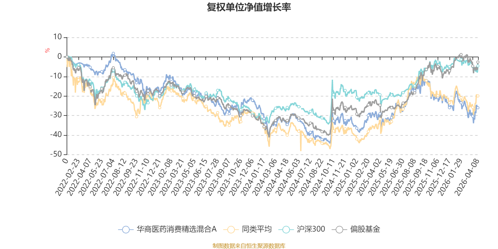 截至4月8日,华商医药消费精选混合A近三个月复权单位净值增长率为-6.54%,位于同类可比基金89/106;近半年复权单位净值增长率为-15.51%,位于同类可比基金97/106;近一年复权单位净值增长率为16.26%,位于同类可比基金89/104;近三年复权单位净值增长率为-12.09%,位于同类可比基金59/78。