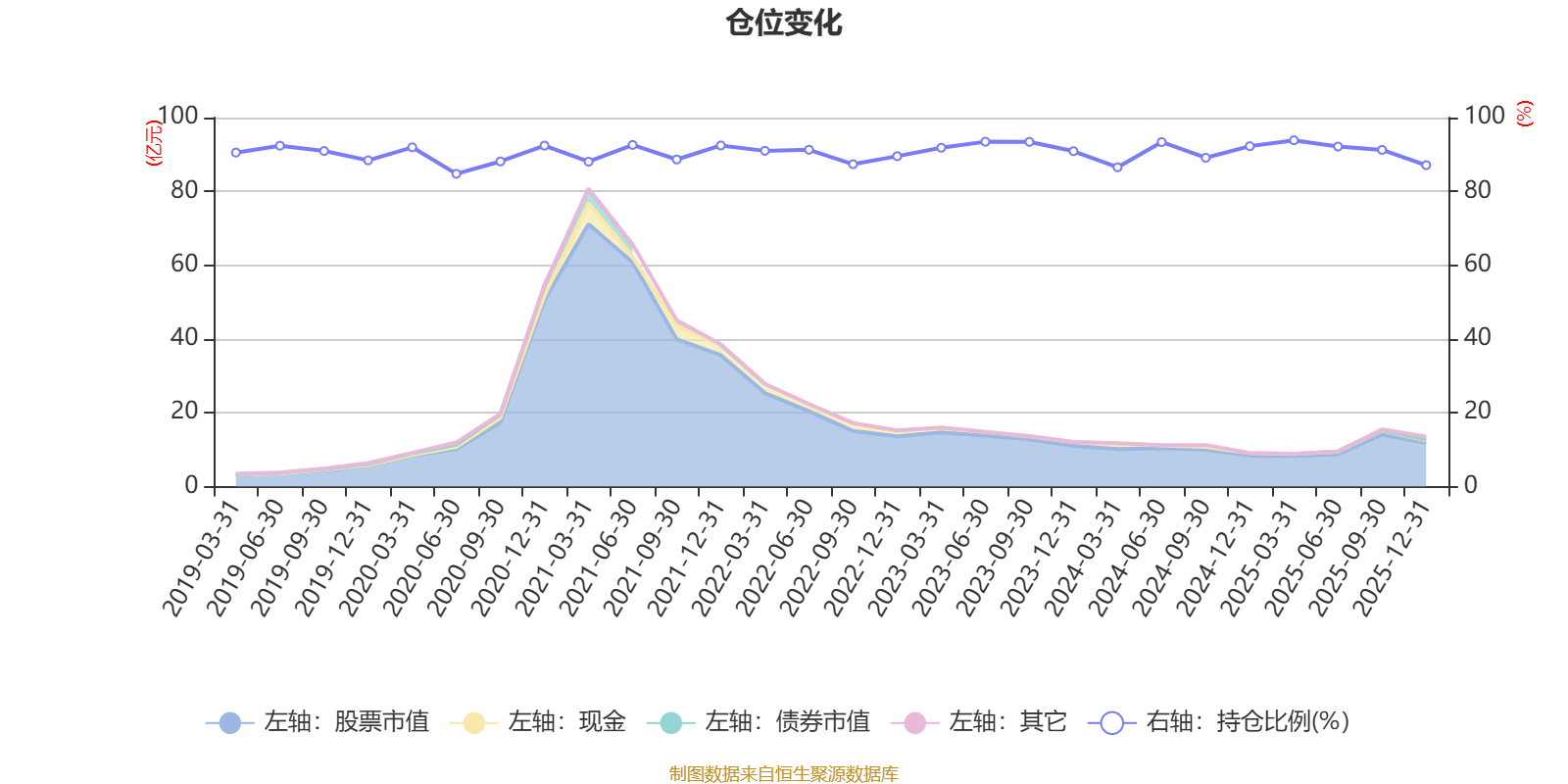 据定期报告数据统计,近三年平均股票仓位为91.27%,同类平均为86.12%。2025年一季度末基金达到93.85%的最高仓位,2020年上半年末最低,为84.77%。