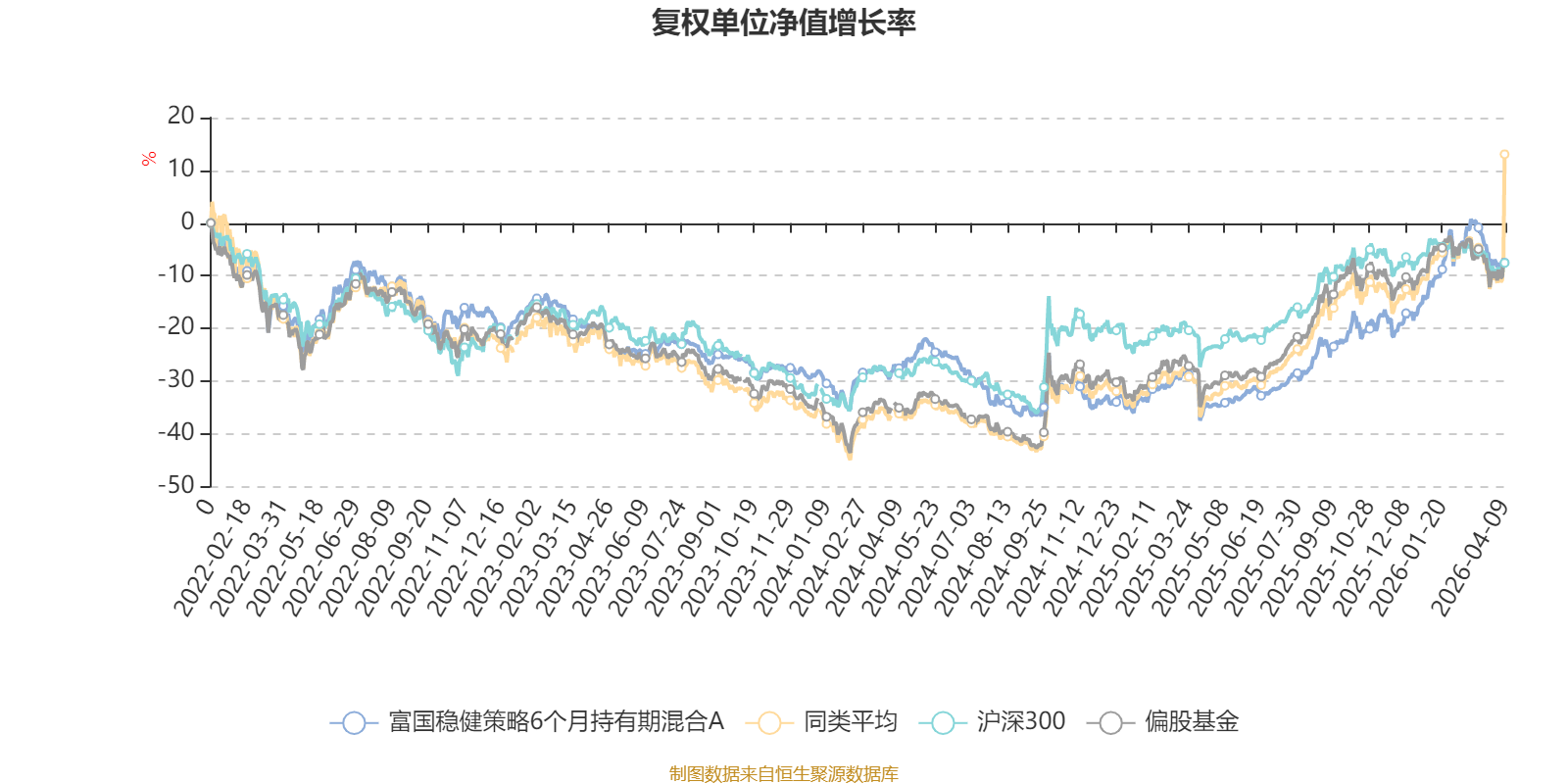 截至4月9日,富国稳健策略6个月持有期混合A近三个月复权单位净值增长率为3.73%,位于同类可比基金57/265;近半年复权单位净值增长率为11.02%,位于同类可比基金50/265;近一年复权单位净值增长率为45.21%,位于同类可比基金111/265;近三年复权单位净值增长率为14.27%,位于同类可比基金142/261。