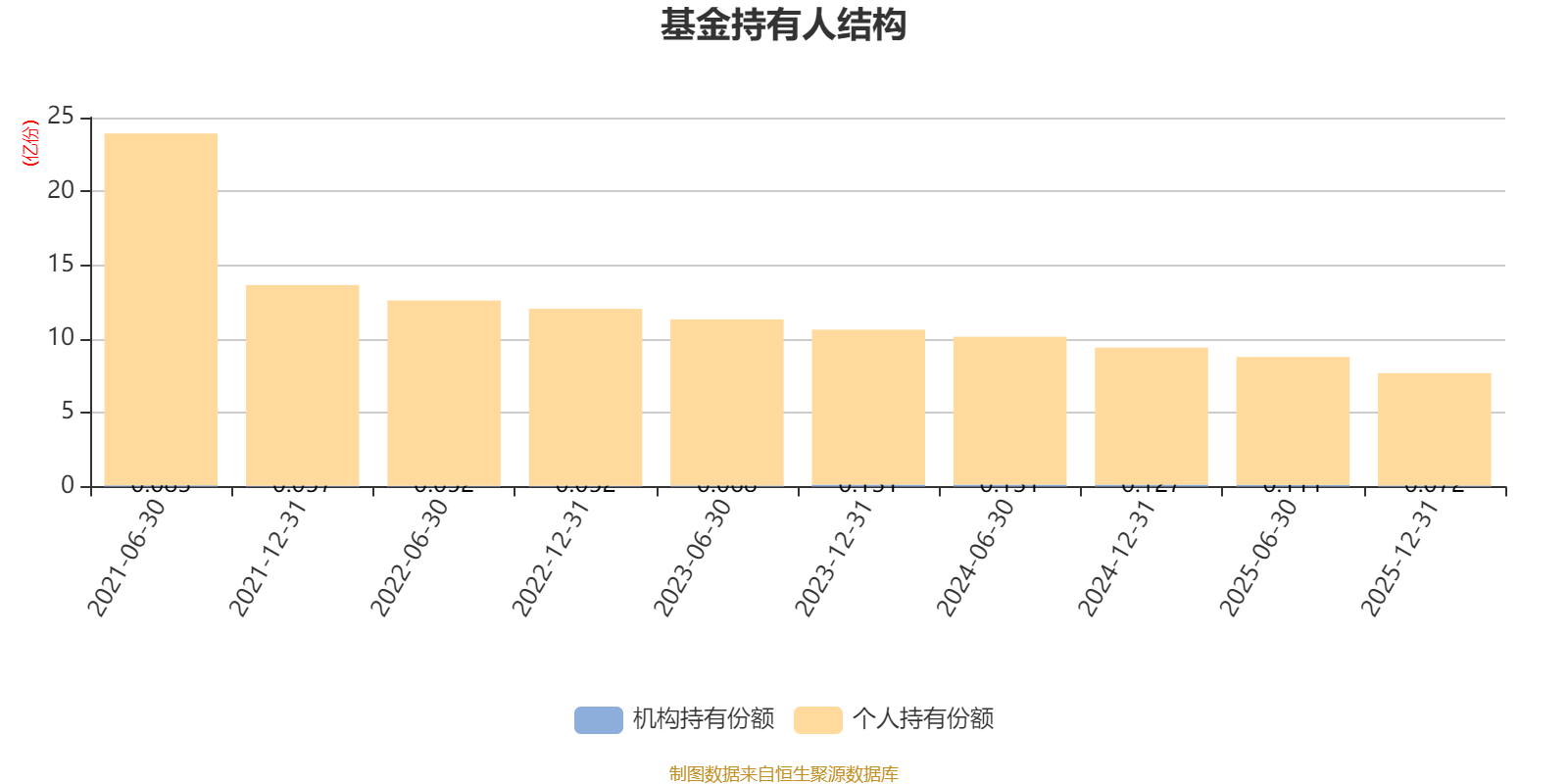 截至2025年12月31日,基金持有人共计106.64万户,合计持有7.68亿份。其中管理人员工持有60.68万份,占比0.08%,机构持有份额占比0.93%,个人投资者占比99.07%。