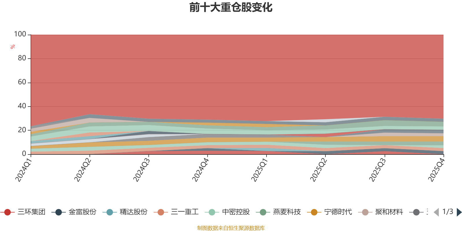 截至2025年末,基金十大重仓股分别是宁德时代、立讯精密、燕麦科技、贵州茅台、奥海科技、三一重工、金雷股份、恒瑞医药、聚和材料、中密控股。