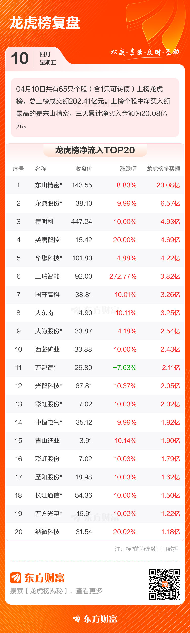 4月10日共有65只个股(含1只可转债)上榜龙虎榜,总上榜成交额202.41亿元。上榜个股中净买入额最高的是东山精密,三天累计净买入金额为20.08亿元。
