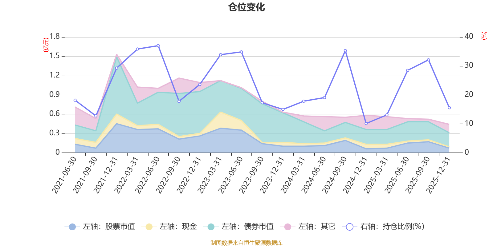 据定期报告数据统计,近三年平均股票仓位为22.68%,同类平均为19.2%。2022年上半年末基金达到36.97%的最高仓位,2024年末最低,为10.07%。