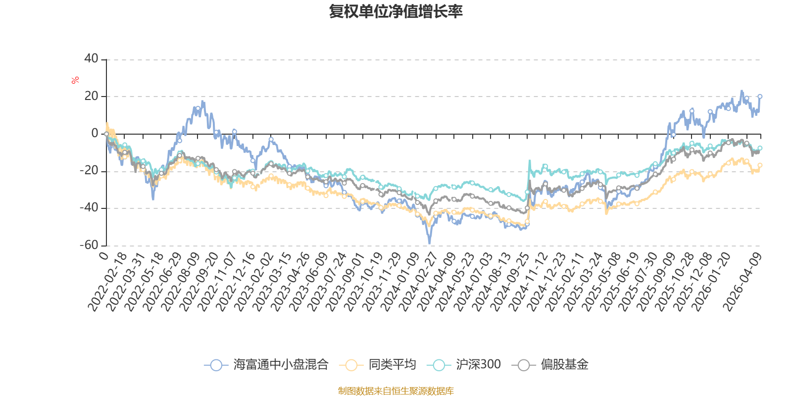 截至4月9日,海富通中小盘混合近三个月复权单位净值增长率为4.48%,位于同类可比基金105/621;近半年复权单位净值增长率为6.67%,位于同类可比基金161/621;近一年复权单位净值增长率为103.44%,位于同类可比基金28/618;近三年复权单位净值增长率为45.51%,位于同类可比基金83/559。