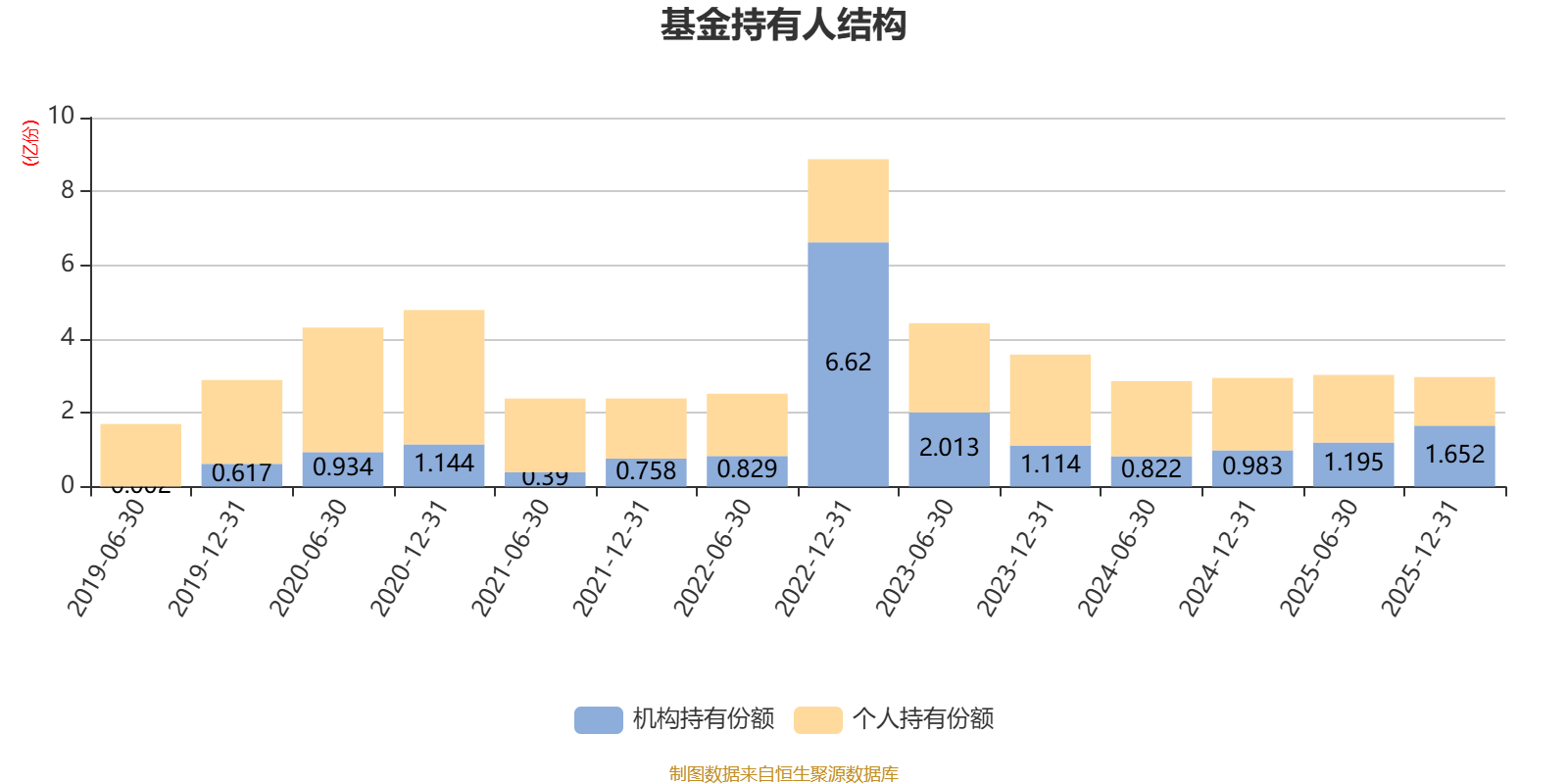 截至2025年12月31日,基金持有人共计1.62万户,合计持有2.97亿份。其中管理人员工持有43.92万份,占比0.15%,机构持有份额占比55.66%,个人投资者占比44.34%。