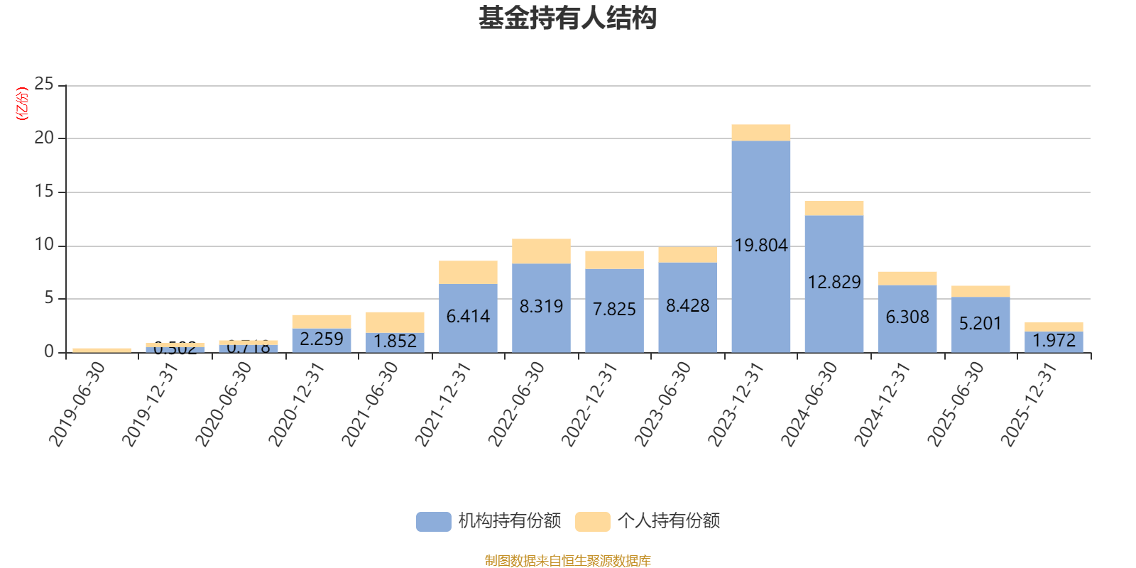 截至2025年12月31日,基金持有人共计1.41万户,合计持有2.82亿份。其中管理人员工持有109.56万份,占比0.39%,机构持有份额占比69.88%,个人投资者占比30.12%。