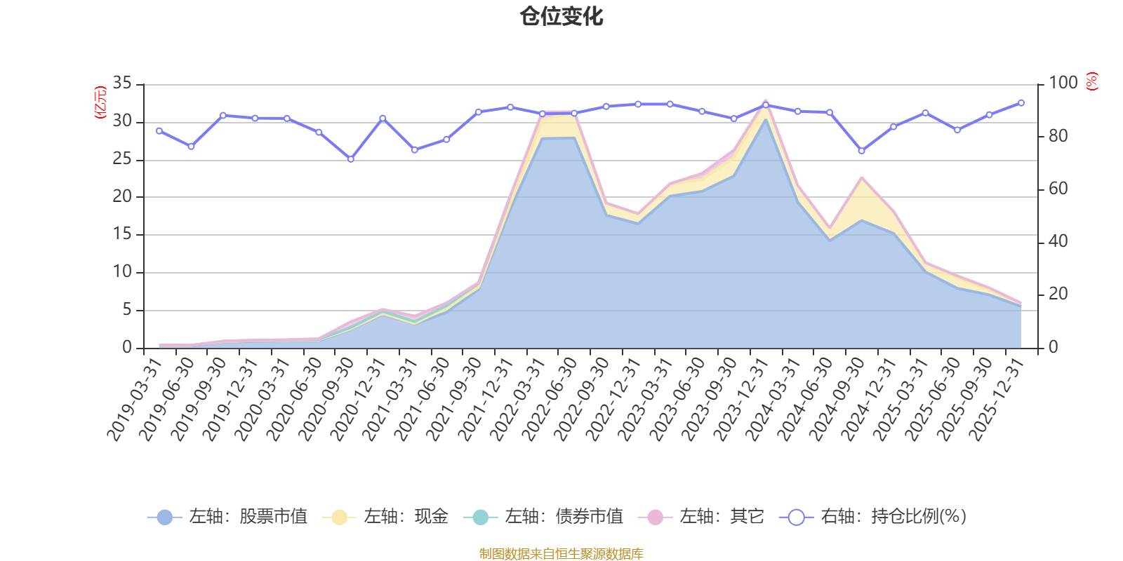 据定期报告数据统计,近三年平均股票仓位为87.66%,同类平均为72.57%。2025年末基金达到92.91%的最高仓位,2020年三季度末最低,为71.61%。