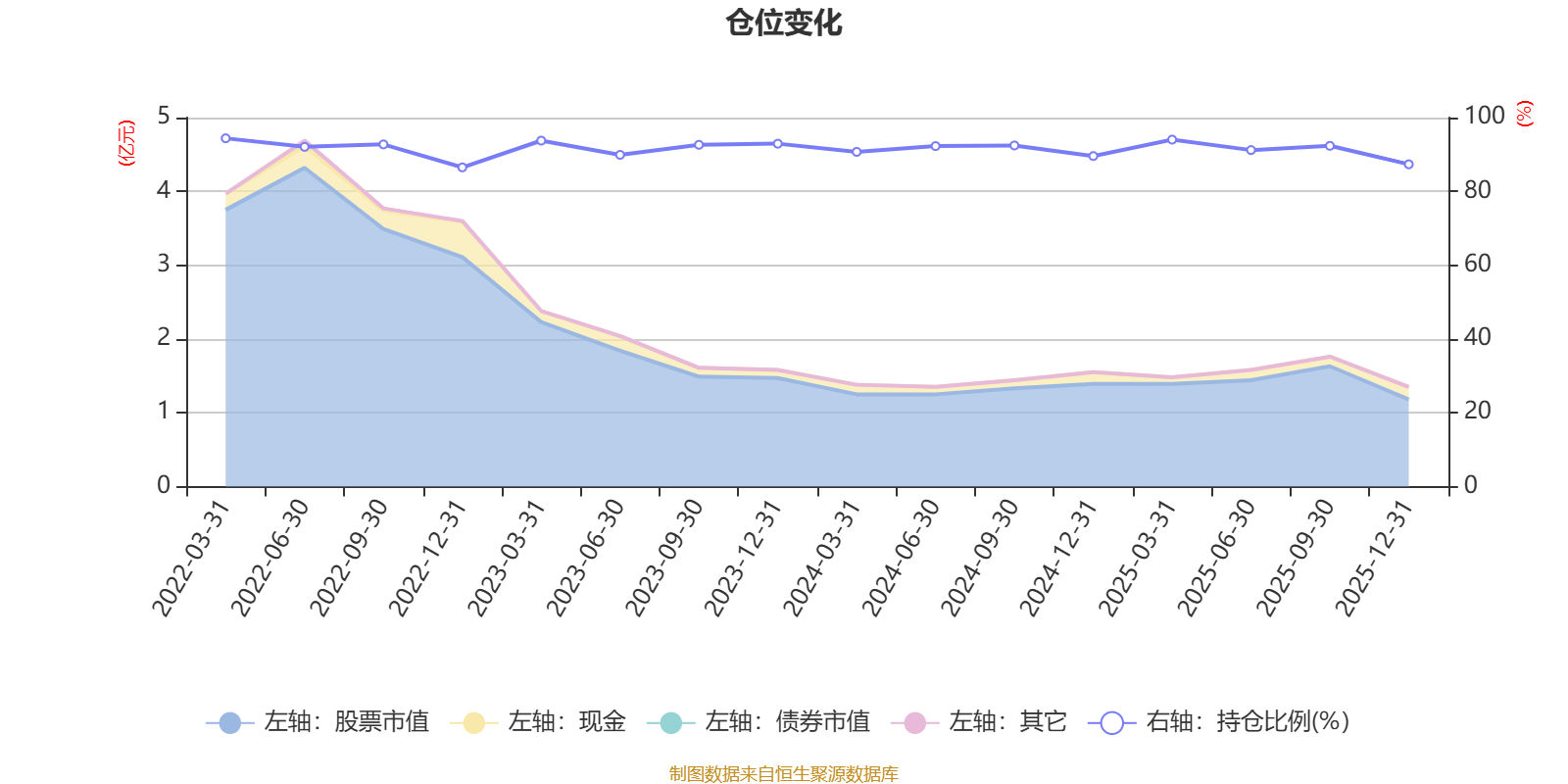 据定期报告数据统计,近三年平均股票仓位为91.6%,同类平均为85.83%。2022年一季度末基金达到94.39%的最高仓位,2022年末最低,为86.51%。