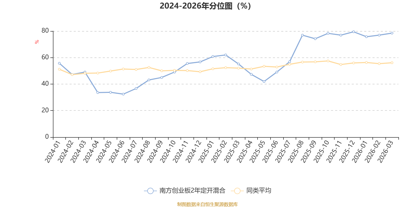 通过所选区间该基金净值增长率分位图,可以观察该基金与同类基金业绩比较情况。图为坐标原点到区间内某时点的净值增长率在同类基金中的分位数。