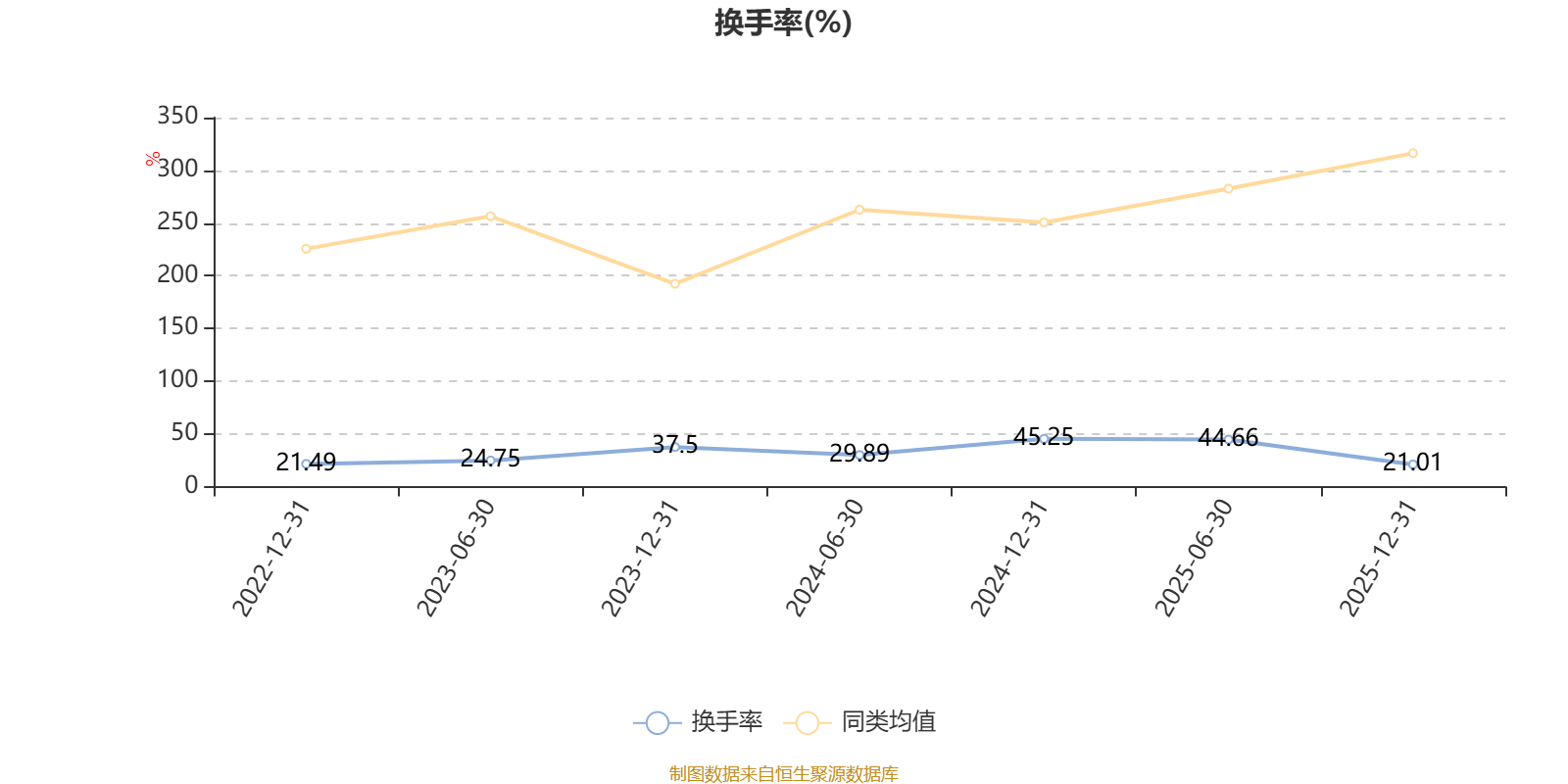 截至2025年12月31日,基金最近一年换手率约66.48%,持续低于同类均值。
