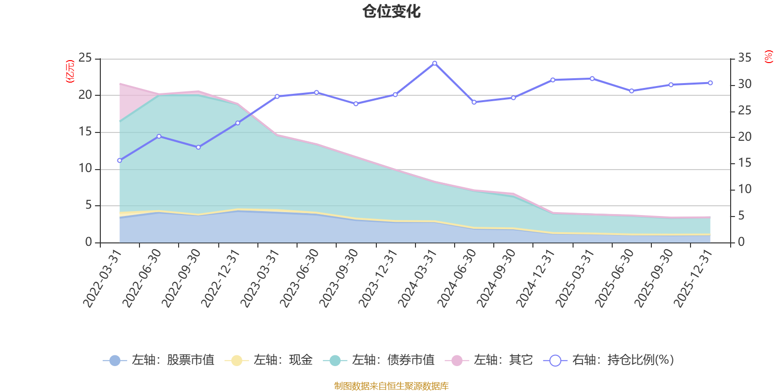 据定期报告数据统计,近三年平均股票仓位为29.24%,同类平均为19.2%。2024年一季度末基金达到34.13%的最高仓位,2022年一季度末最低,为15.64%。