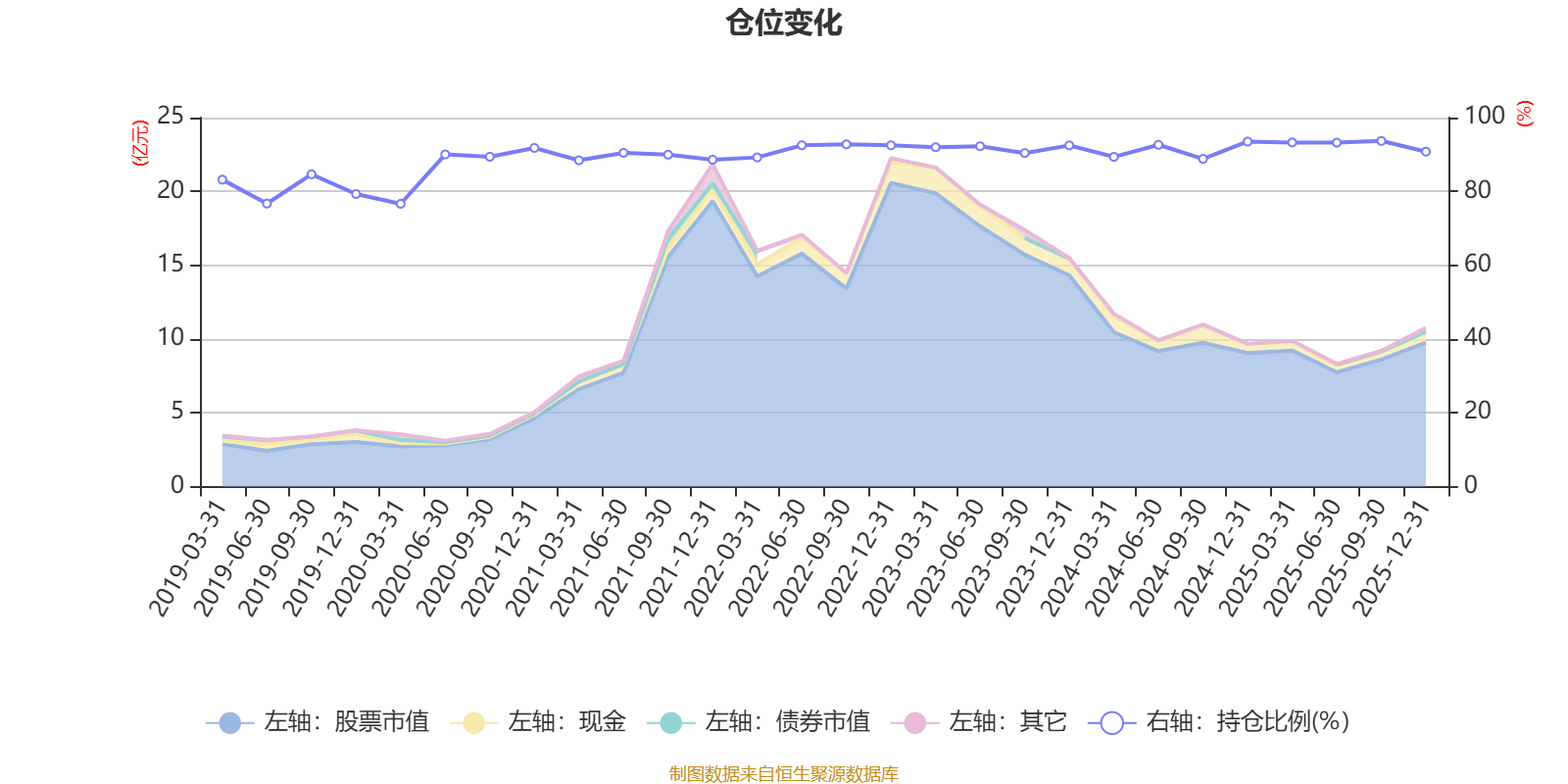 据定期报告数据统计,近三年平均股票仓位为91.86%,同类平均为86.12%。2025年三季度末基金达到93.68%的最高仓位,2020年一季度末最低,为76.63%。