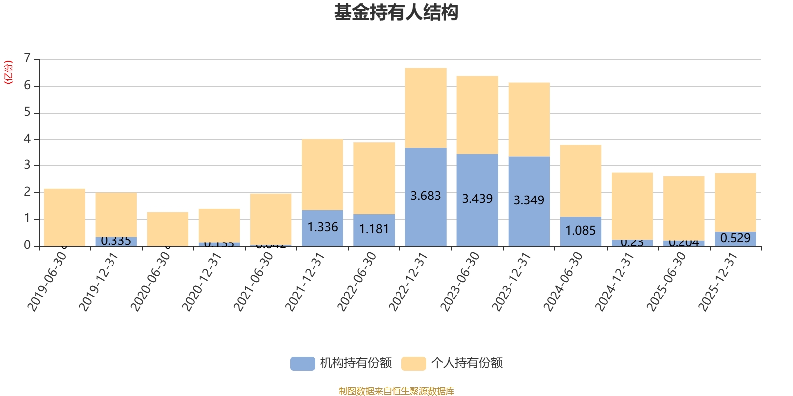 截至2025年12月31日,基金持有人共计2.35万户,合计持有2.73亿份。其中管理人员工持有306.18万份,占比1.12%,机构持有份额占比19.38%,个人投资者占比80.62%。