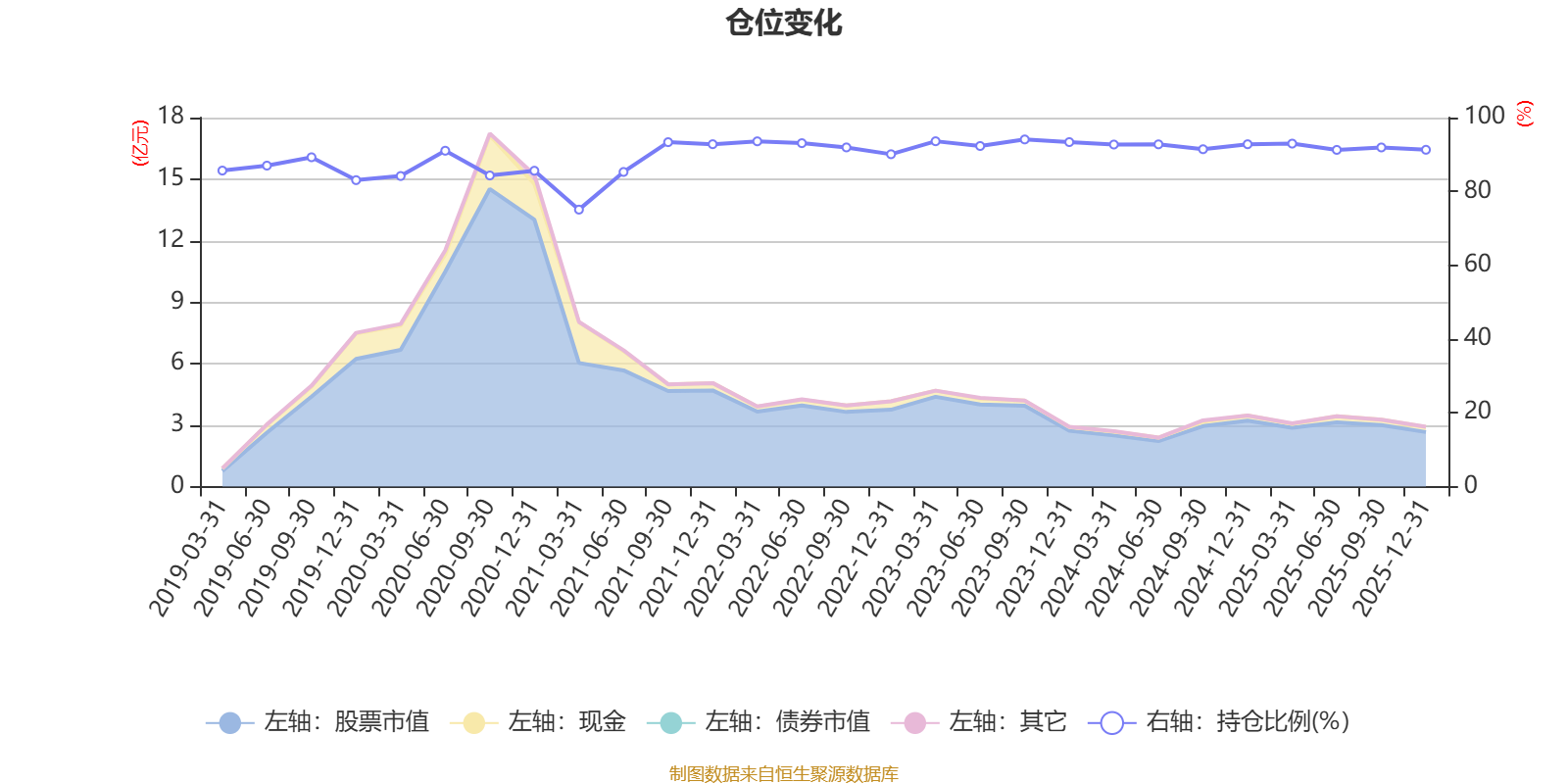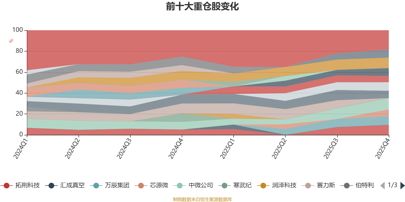 该基金持股集中度较高,近2年前十大重仓股集中度长期超过60%。截至2025年末,基金十大重仓股分别是中微公司、北方华创、拓荆科技、万辰集团、江淮汽车、潮宏基、中宠股份、北汽蓝谷、芯源微、若羽臣。