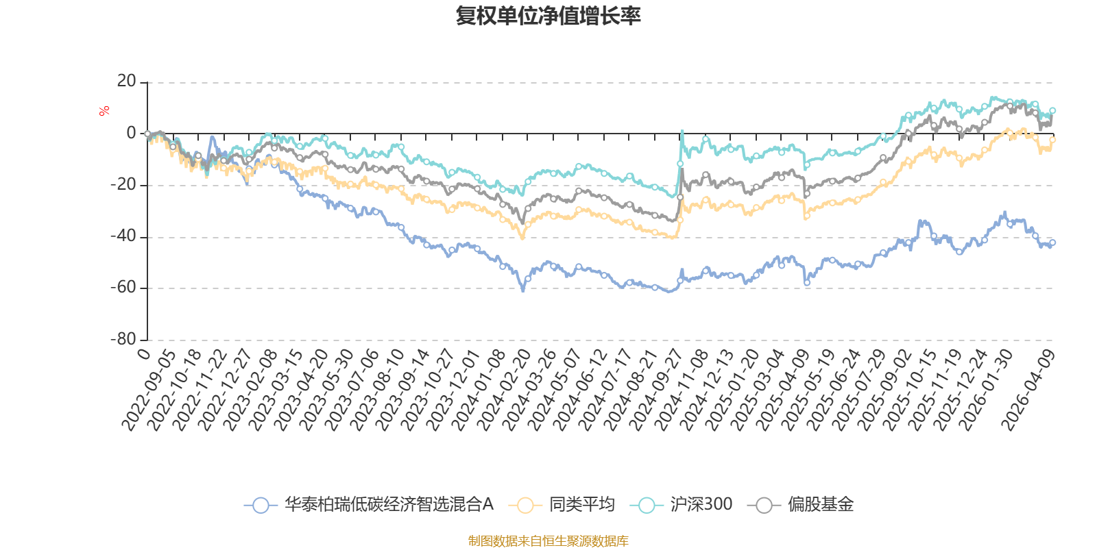 截至4月9日,华泰柏瑞低碳经济智选混合A近三个月复权单位净值增长率为-10.49%,位于同类可比基金573/621;近半年复权单位净值增长率为-9.88%,位于同类可比基金542/621;近一年复权单位净值增长率为36.70%,位于同类可比基金323/618;近三年复权单位净值增长率为-24.49%,位于同类可比基金541/559。