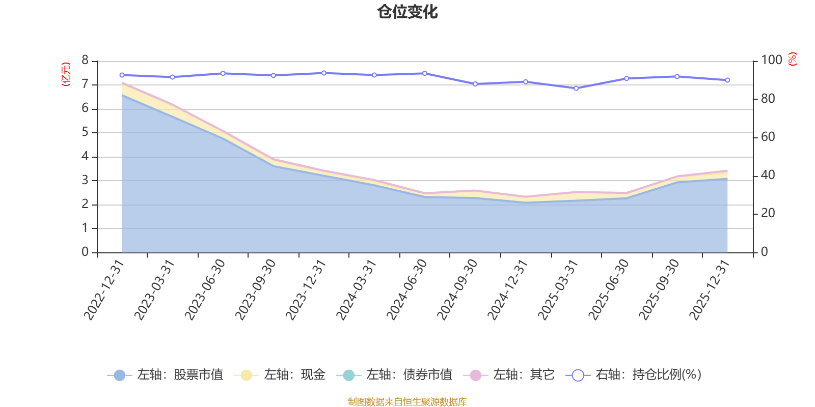 据定期报告数据统计,近三年平均股票仓位为91.14%,同类平均为85.83%。2023年末基金达到93.76%的最高仓位,2025年一季度末最低,为85.78%。