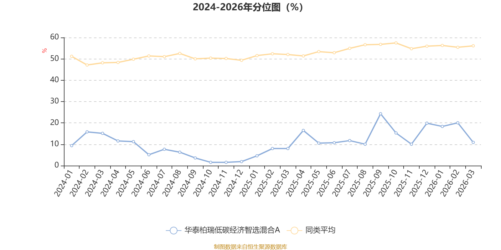通过所选区间该基金净值增长率分位图,可以观察该基金与同类基金业绩比较情况。图为坐标原点到区间内某时点的净值增长率在同类基金中的分位数。