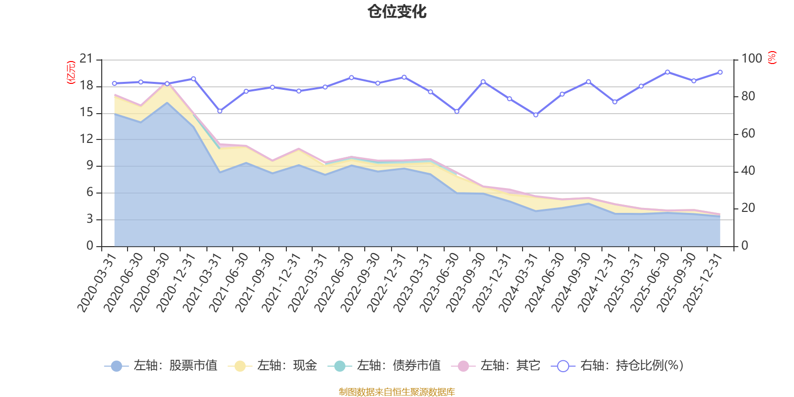 据定期报告数据统计,近三年平均股票仓位为83.36%,同类平均为85.83%。2025年上半年末基金达到93.29%的最高仓位,2024年一季度末最低,为70.39%。
