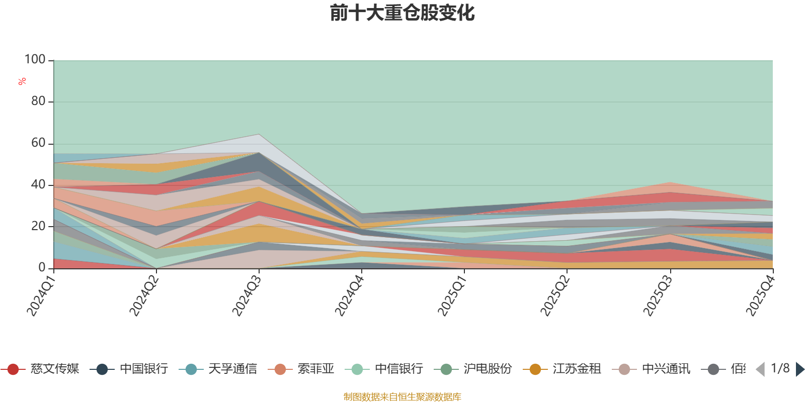 截至2025年末,基金十大重仓股分别是中国平安、江苏金租、交通银行、华泰证券、赤峰黄金、美的集团、兴业银行、中信特钢、新媒股份、国光股份。