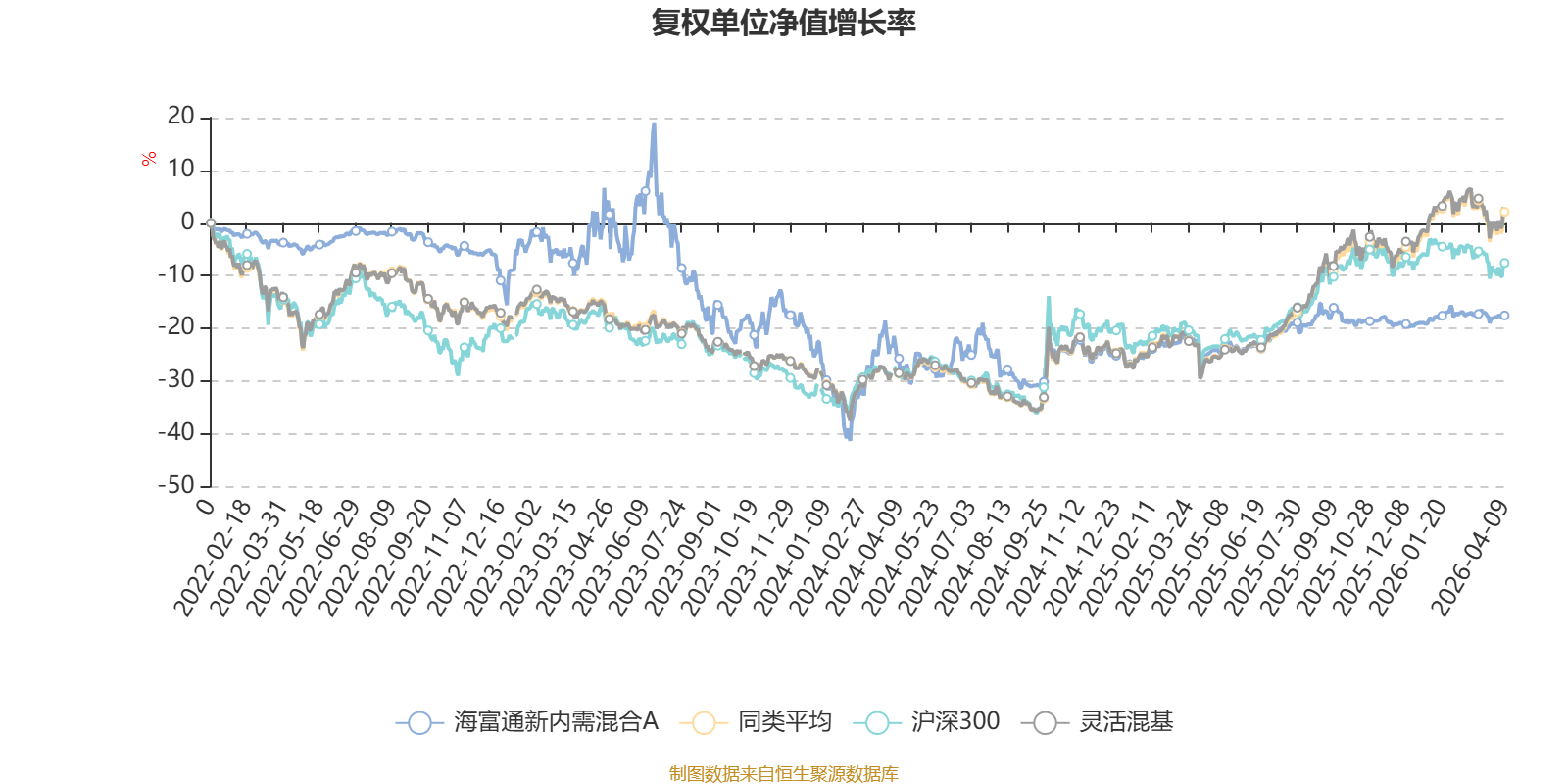 截至4月9日,海富通新内需混合A近三个月复权单位净值增长率为0.94%,位于同类可比基金434/1287;近半年复权单位净值增长率为1.25%,位于同类可比基金688/1286;近一年复权单位净值增长率为11.21%,位于同类可比基金1018/1286;近三年复权单位净值增长率为-19.36%,位于同类可比基金1201/1286。