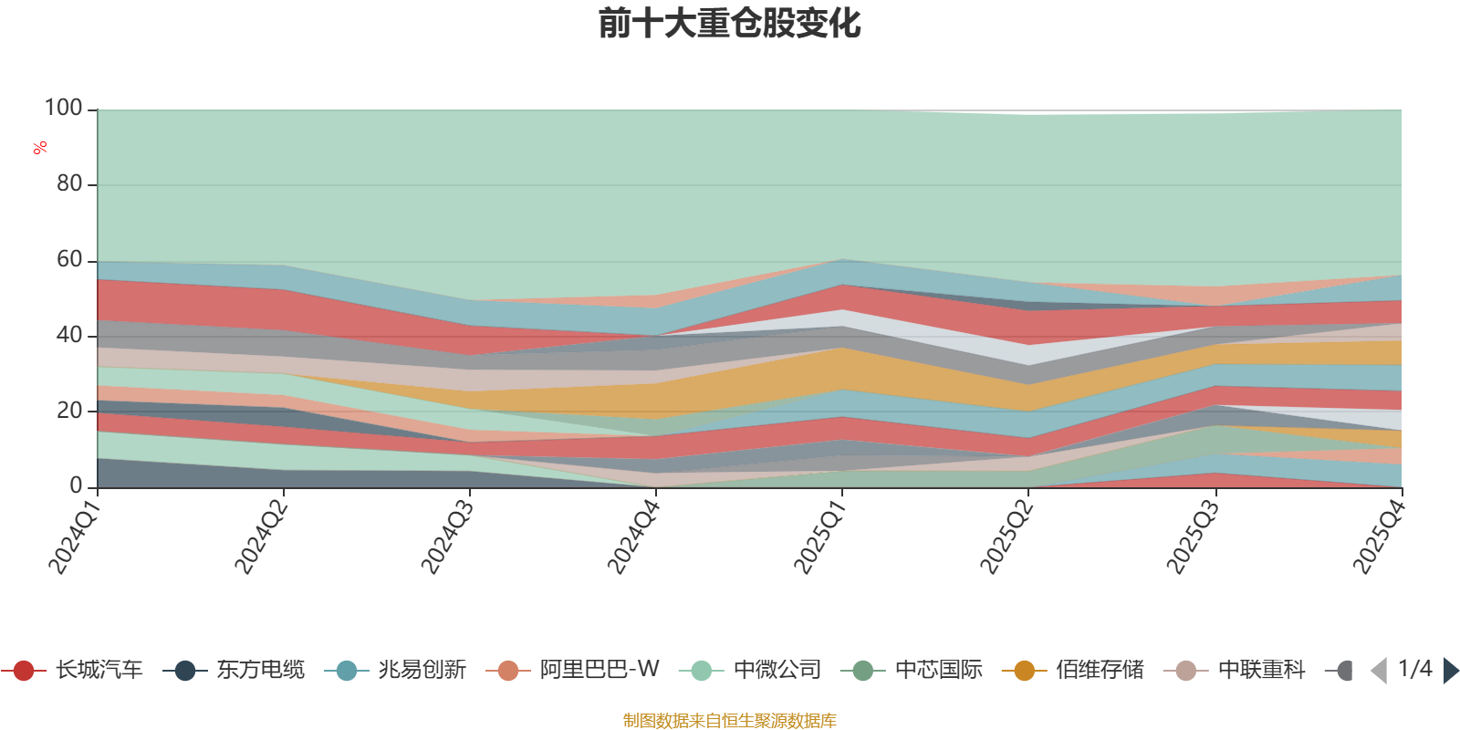 截至2025年末,基金十大重仓股分别是TCL科技、立讯精密、腾讯控股、兆易创新、北方华创、寒武纪、宁德时代、京东方A、佰维存储、阿里巴巴-W。