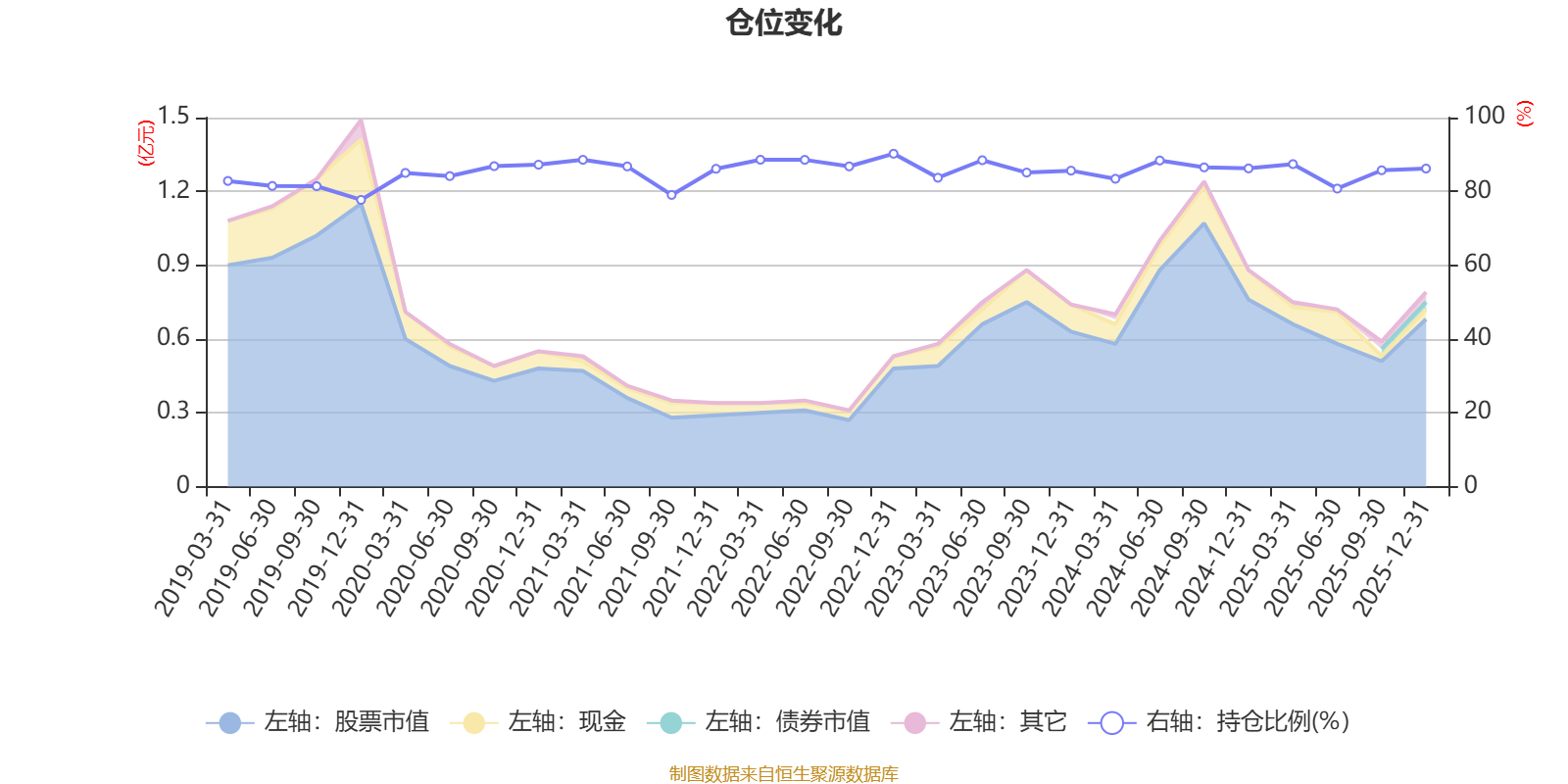 据定期报告数据统计,近三年平均股票仓位为85.62%,同类平均为88.34%。2022年末基金达到90.21%的最高仓位,2019年末最低,为77.7%。