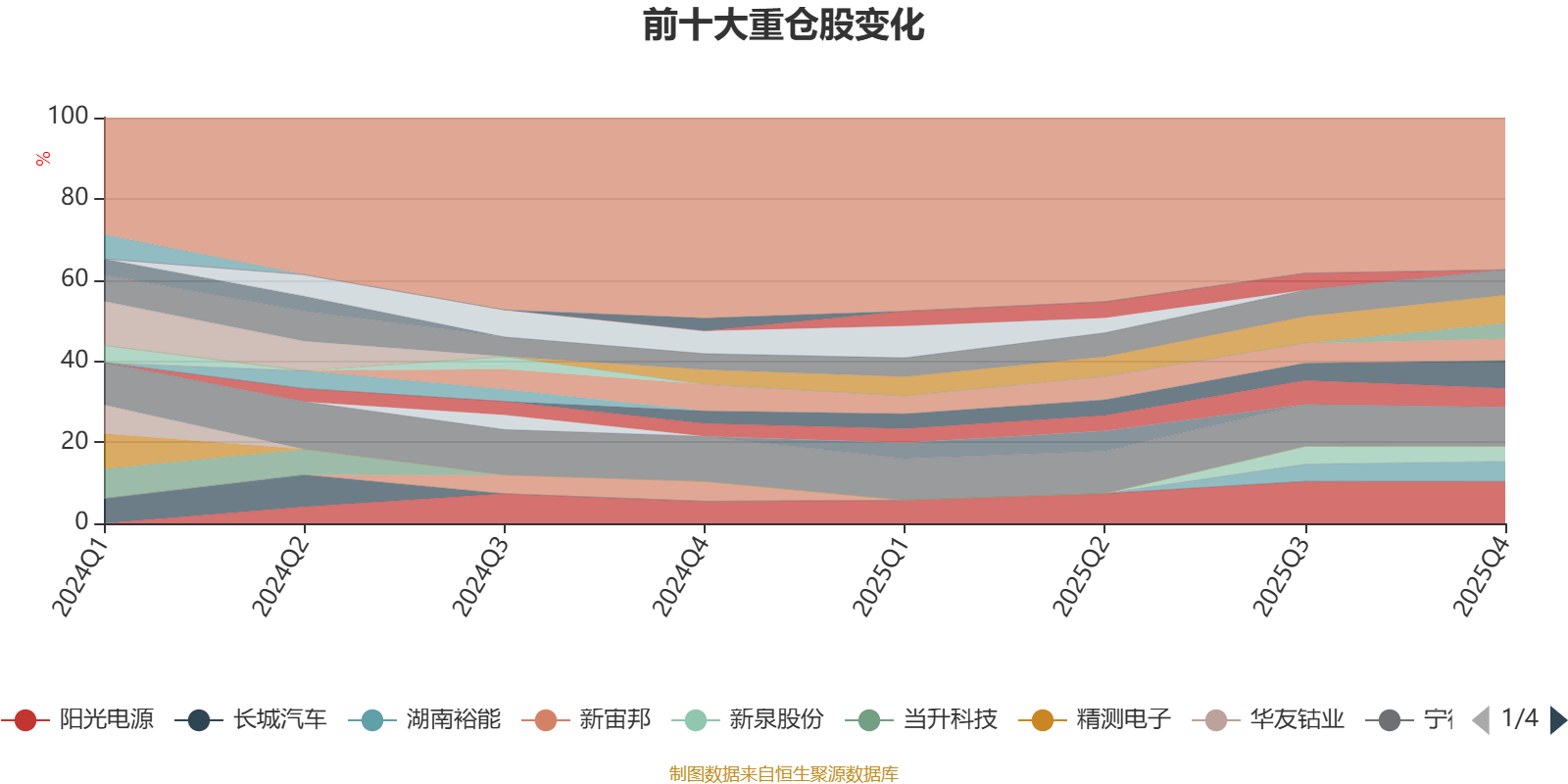 该基金持股集中度较高。截至2025年末,基金十大重仓股分别是阳光电源、宁德时代、科达利、思源电气、璞泰来、宇通客车、湖南裕能、亿纬锂能、天赐材料、新泉股份。
