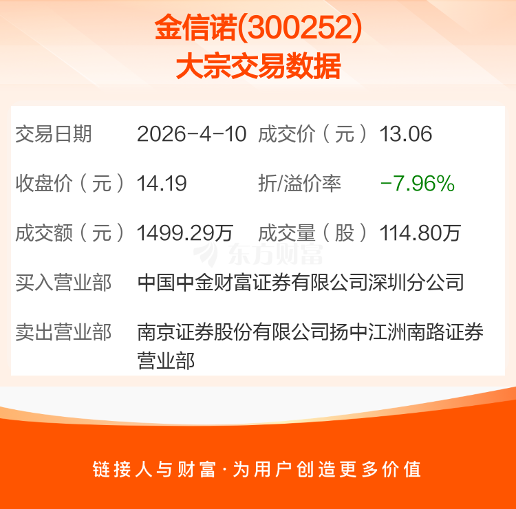 2026年4月10日,金信诺发生1笔大宗交易,共成交114.80万股,成交金额1499.29万元,占其流通市值比例为0.19%。
