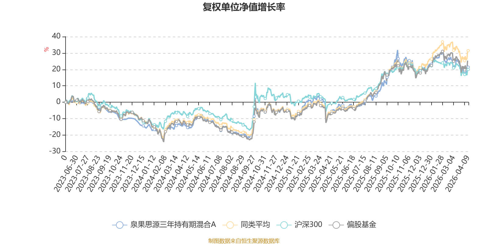 截至4月9日,泉果思源三年持有期混合A近三个月复权单位净值增长率为-4.31%,位于同类可比基金93/130;近半年复权单位净值增长率为-7.94%,位于同类可比基金104/130;近一年复权单位净值增长率为34.40%,位于同类可比基金73/130。