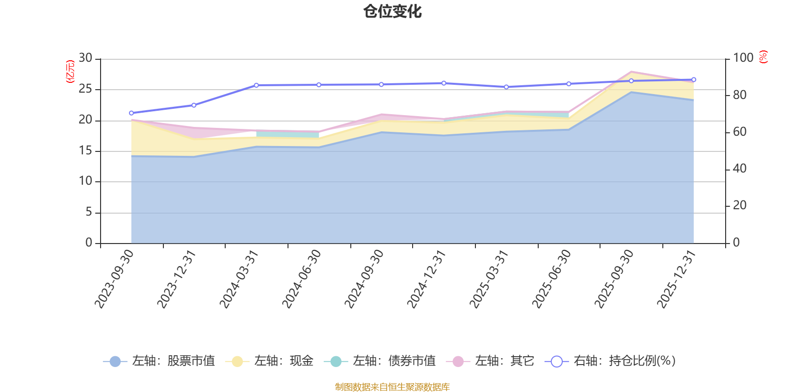 据定期报告数据统计,成立以来平均股票仓位为83.79%,同类平均为86.17%。2025年末基金达到88.73%的最高仓位,2023年三季度末最低,为70.61%。