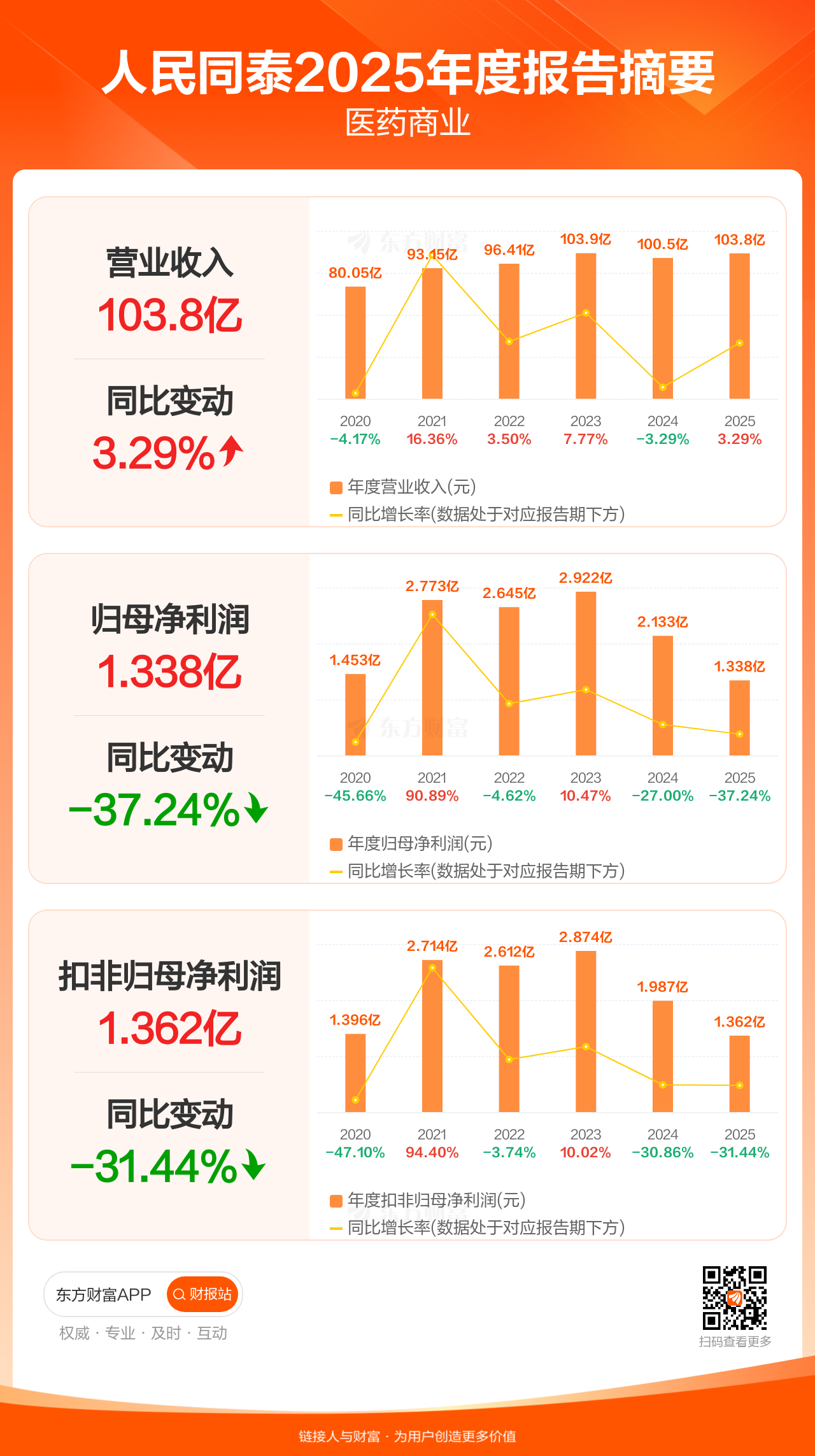 人民同泰4月11日发布2025年年报显示,公司全年实现营业收入103.79亿元,同比增长3.29%;归母净利润1.34亿元,同比下滑37.24%;扣非归母净利润1.36亿元,同比下滑31.44%。