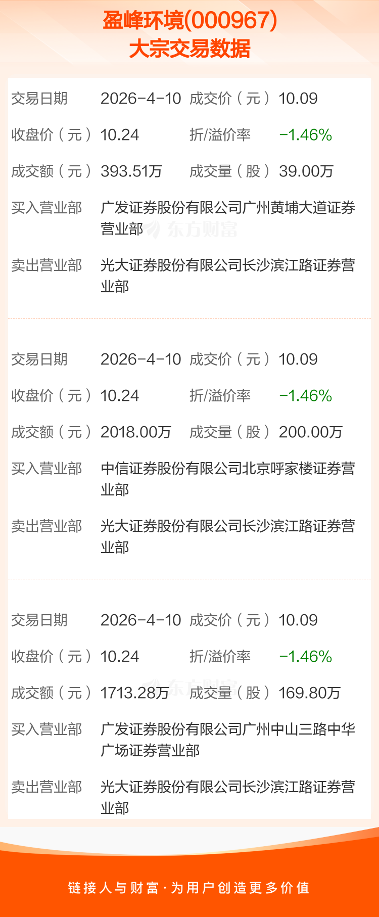 2026年4月10日,盈峰环境发生3笔大宗交易,共成交408.80万股,成交金额4124.79万元,占其流通市值比例为0.13%。