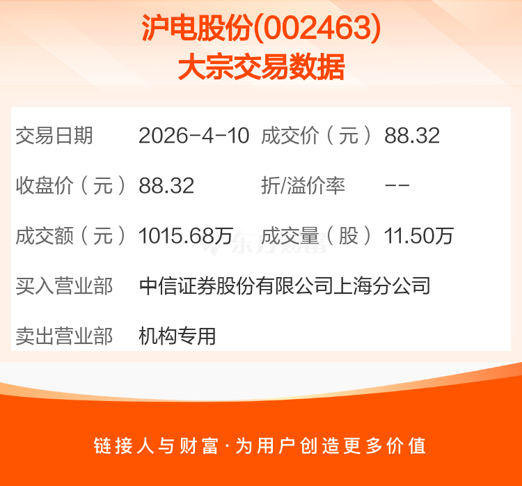 2026年4月10日,沪电股份发生1笔大宗交易,共成交11.50万股,成交金额1015.68万元。