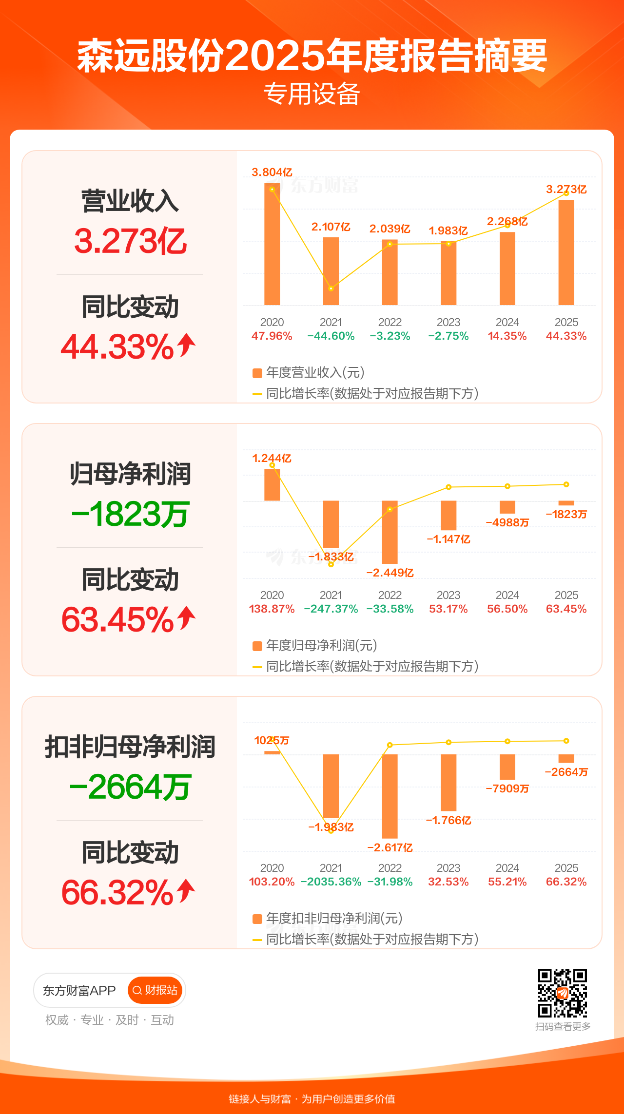森远股份4月11日发布2025年年报显示,公司全年实现营业收入3.27亿元,同比增长44.33%;归母净利润-1823.15万元;扣非归母净利润-2663.96万元。