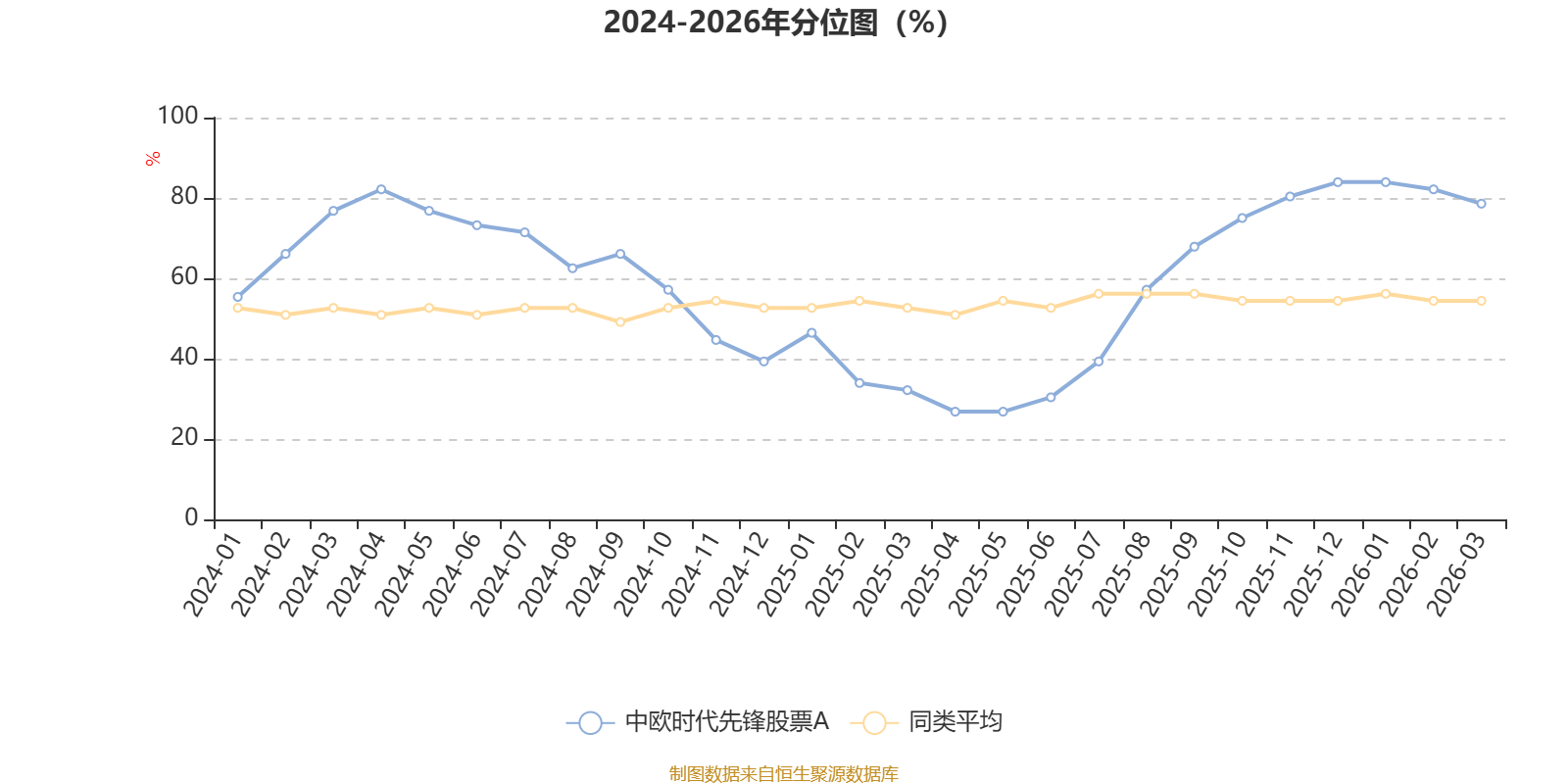 通过所选区间该基金净值增长率分位图,可以观察该基金与同类基金业绩比较情况。图为坐标原点到区间内某时点的净值增长率在同类基金中的分位数。