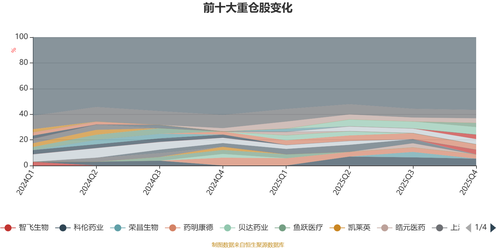 截至2025年末,基金十大重仓股分别是恒瑞医药、海思科、科伦药业、新诺威、华东医药、泰格医药、艾力斯、特宝生物、药明康德、热景生物。