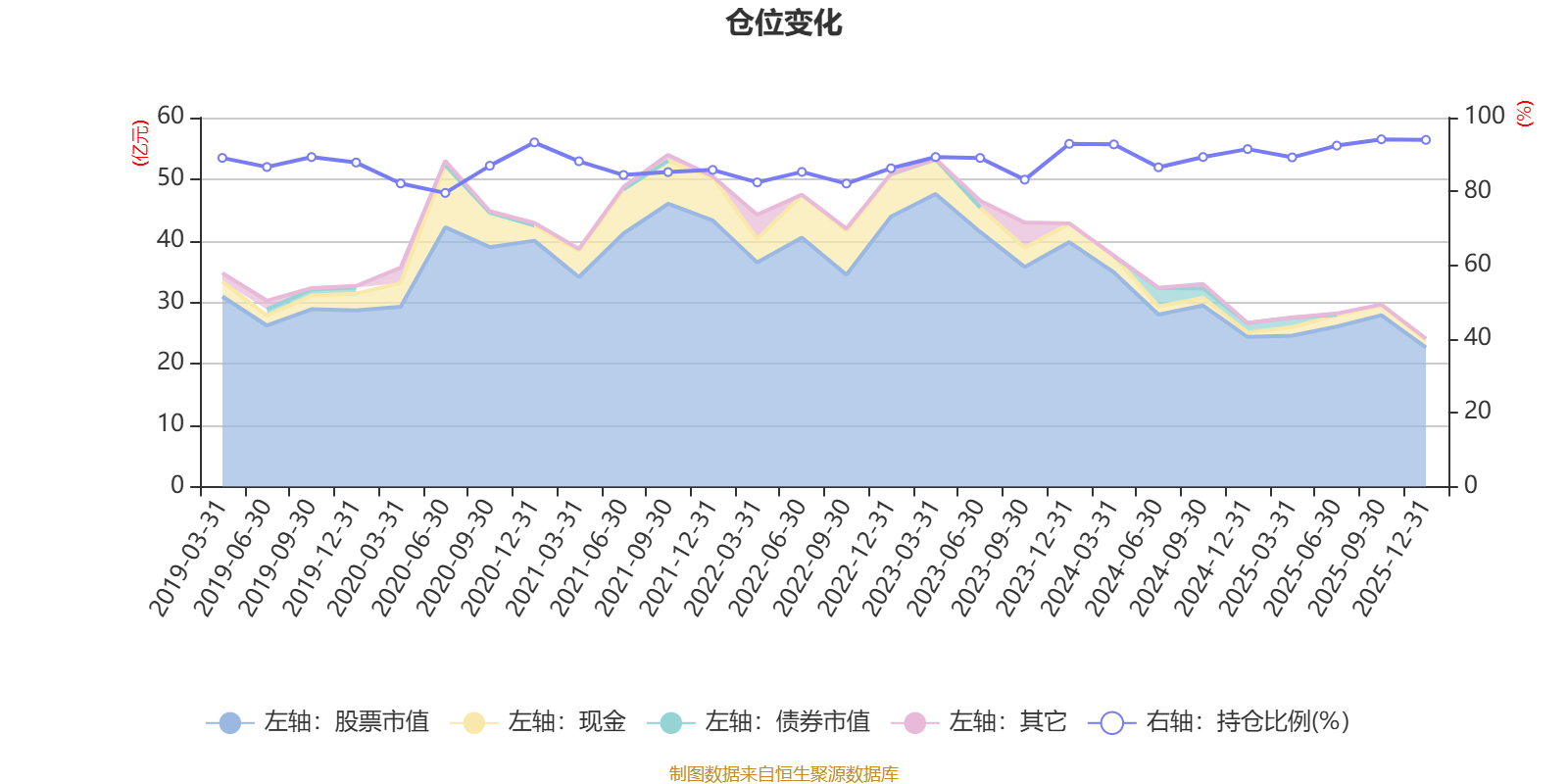 据定期报告数据统计,近三年平均股票仓位为90.35%,同类平均为88.23%。2025年三季度末基金达到94.11%的最高仓位,2020年上半年末最低,为79.59%。
