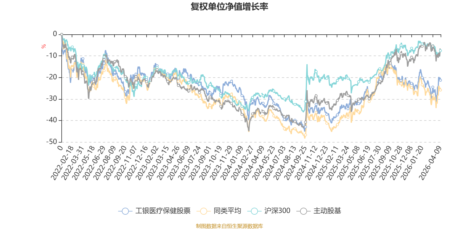 截至4月9日,工银医疗保健股票近三个月复权单位净值增长率为-4.63%,位于同类可比基金17/57;近半年复权单位净值增长率为-5.47%,位于同类可比基金11/57;近一年复权单位净值增长率为21.08%,位于同类可比基金33/57;近三年复权单位净值增长率为-5.54%,位于同类可比基金17/48。