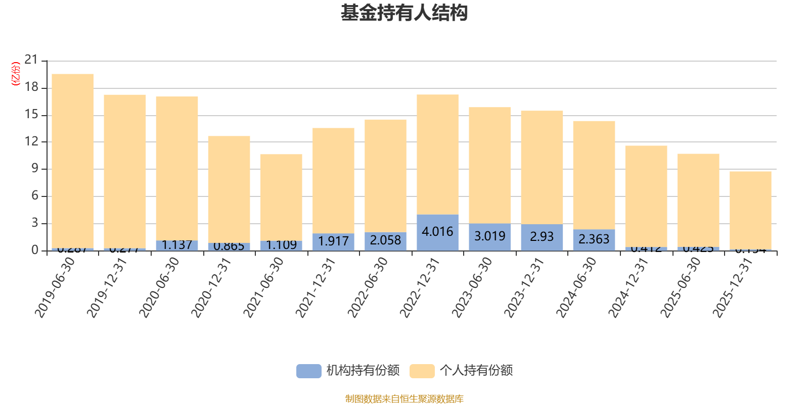 截至2025年12月31日,基金持有人共计11.66万户,合计持有8.76亿份。其中管理人员工持有27.21万份,占比0.03%,机构持有份额占比1.76%,个人投资者占比98.24%。