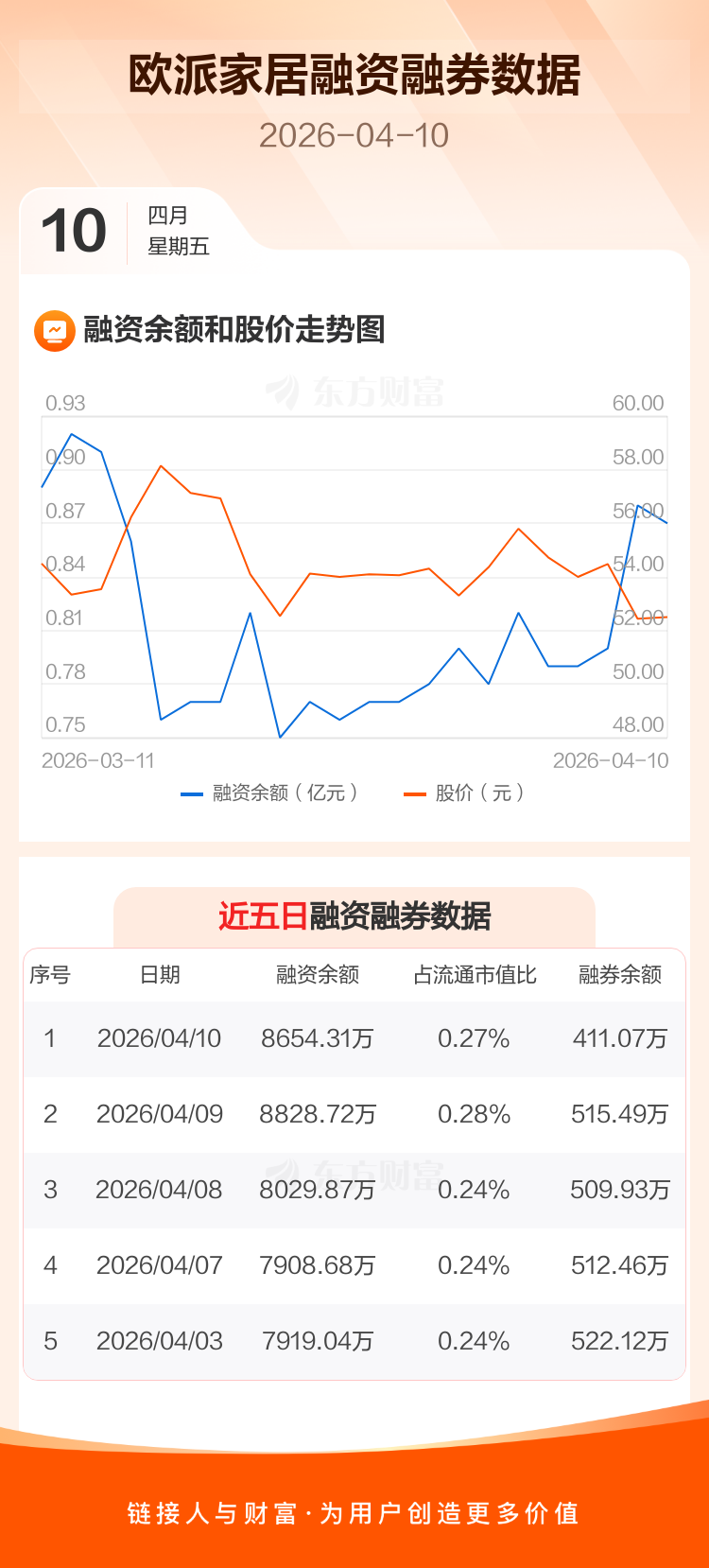 交易所最新数据显示,欧派家居于2026年4月10日获融资买入404.10万元,融资偿还578.51万元,当日融资净偿还174.4万元。目前,该股融资余额8654.31万,占流通市值比例为0.27%。