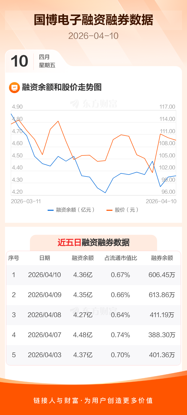 交易所最新数据显示,国博电子于2026年4月10日获融资买入4569.77万元,融资偿还4392.35万元,当日融资净买入177.42万元。目前,该股融资余额4.36亿,占流通市值比例为0.67%。