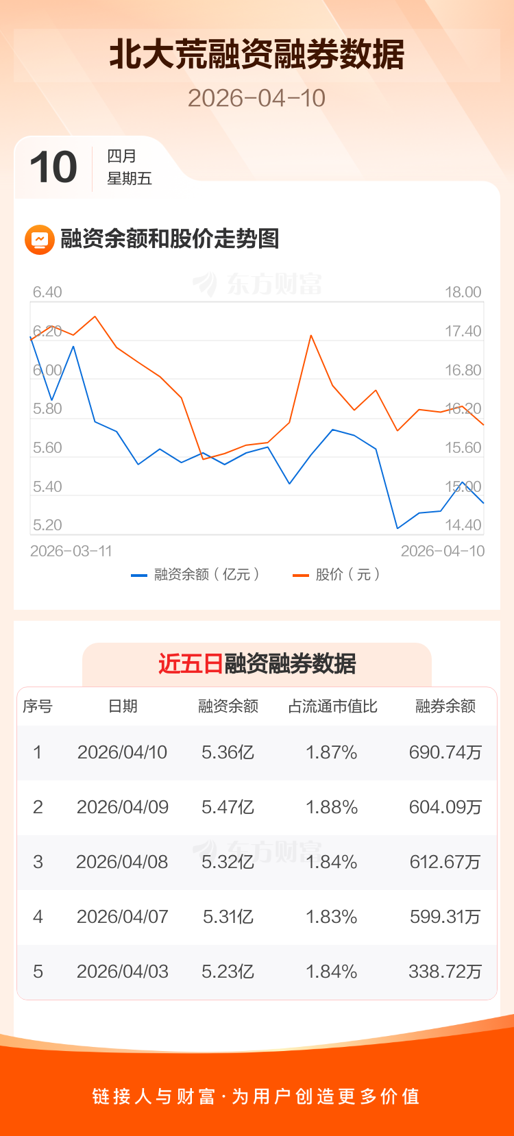 交易所最新数据显示,北大荒于2026年4月10日获融资买入4003.22万元,融资偿还5086.03万元,当日融资净偿还1082.81万元。目前,该股融资余额5.36亿,占流通市值比例为1.87%。