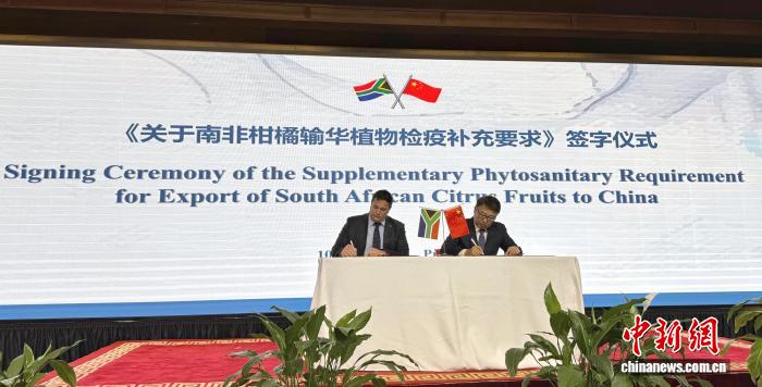 中新社比勒陀利亚4月10日电(记者孙翔)中国驻南非大使吴鹏、南非农业部长斯廷黑森10日分别代表两国政府,在位于南非行政首都比勒陀利亚的中国驻南非大使馆签署《关于南非柑橘输华植物检疫补充要求》。