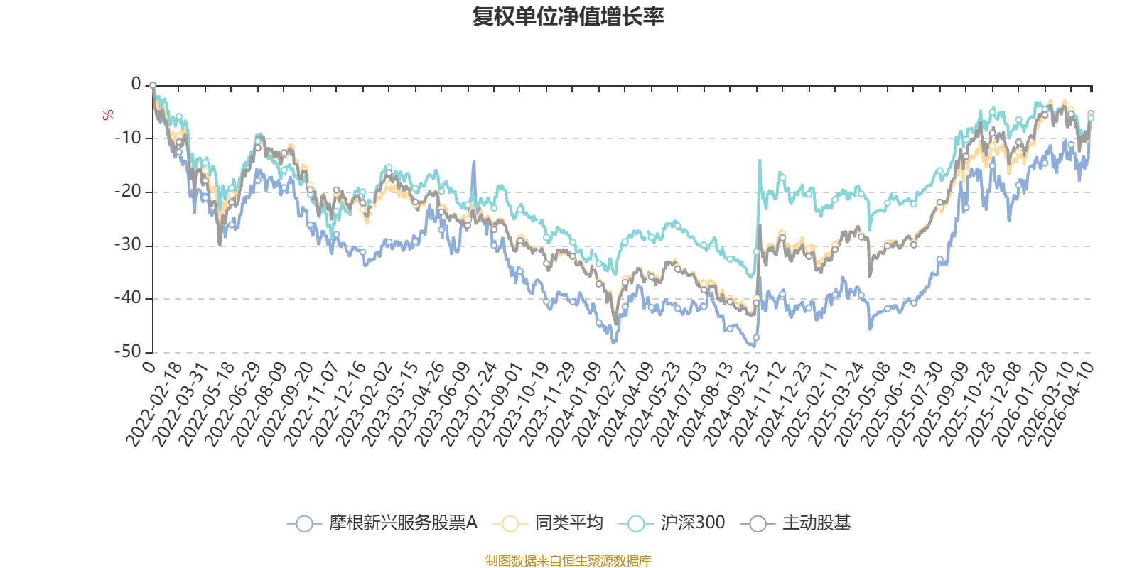 该基金属于标准股票型基金。截至4月10日,单位净值为2.176元。基金经理是杨景喻,目前管理的5只基金近一年均为正收益。其中,截至4月10日,摩根新兴服务股票A近一年复权单位净值增长率最高,达70.1%;摩根民生需求股票A最低,为64.61%。