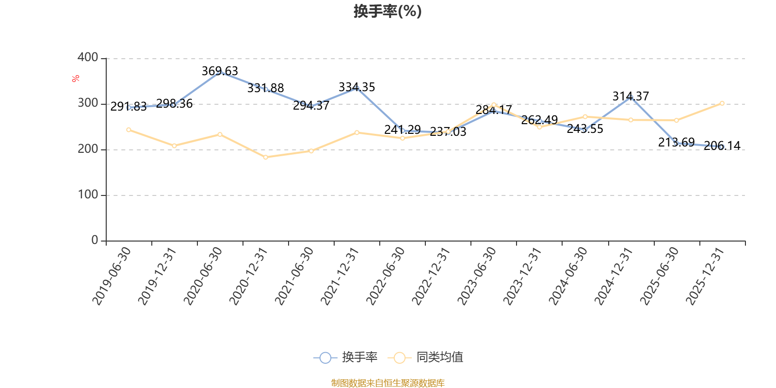 截至2025年12月31日,基金最近一年换手率约413.44%,持续1年低于同类均值。