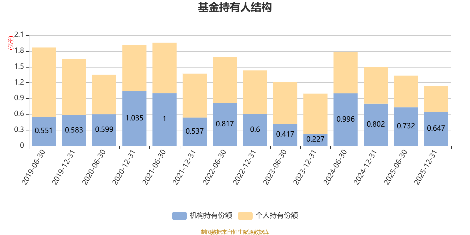 截至2025年12月31日,基金持有人共计1.22万户,合计持有1.14亿份。其中管理人员工持有1.92万份,占比0.02%,机构持有份额占比56.79%,个人投资者占比43.21%。