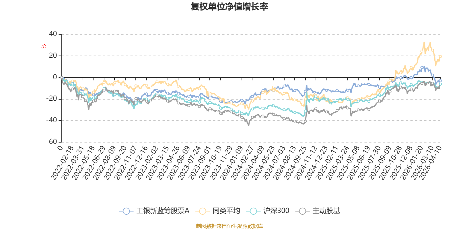 截至4月10日,工银新蓝筹股票A近三个月复权单位净值增长率为-8.17%,位于同类可比基金11/13;近半年复权单位净值增长率为-2.22%,位于同类可比基金12/13;近一年复权单位净值增长率为7.31%,位于同类可比基金13/13;近三年复权单位净值增长率为11.84%,位于同类可比基金6/9。