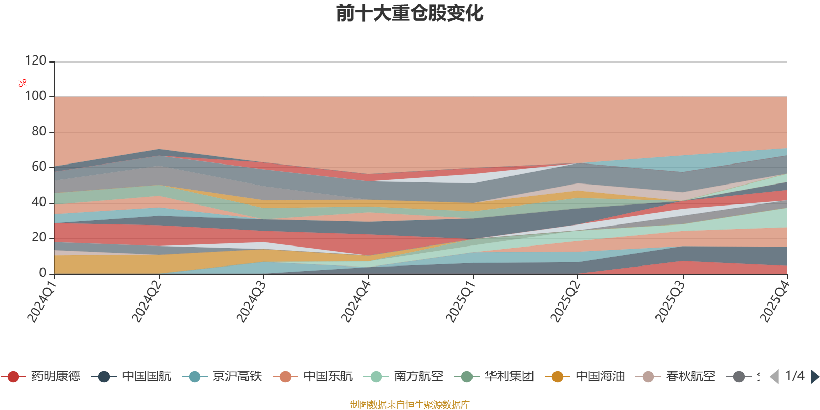 该基金持股集中度较高。截至2025年末,基金十大重仓股分别是南方航空、中国东航、中国国航、山东黄金、长江电力、中国电信、山金国际、药明康德、紫金矿业、分众传媒。
